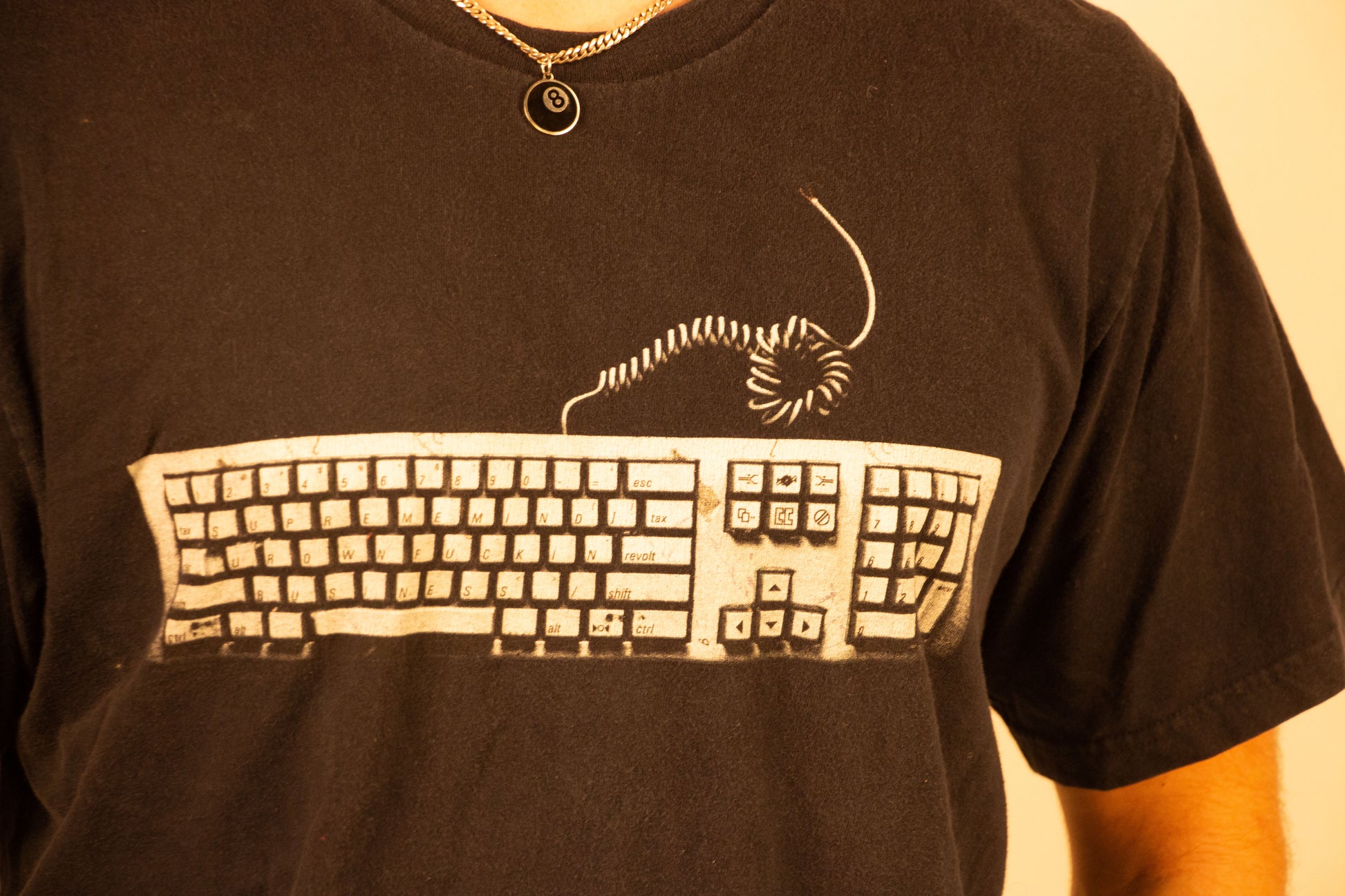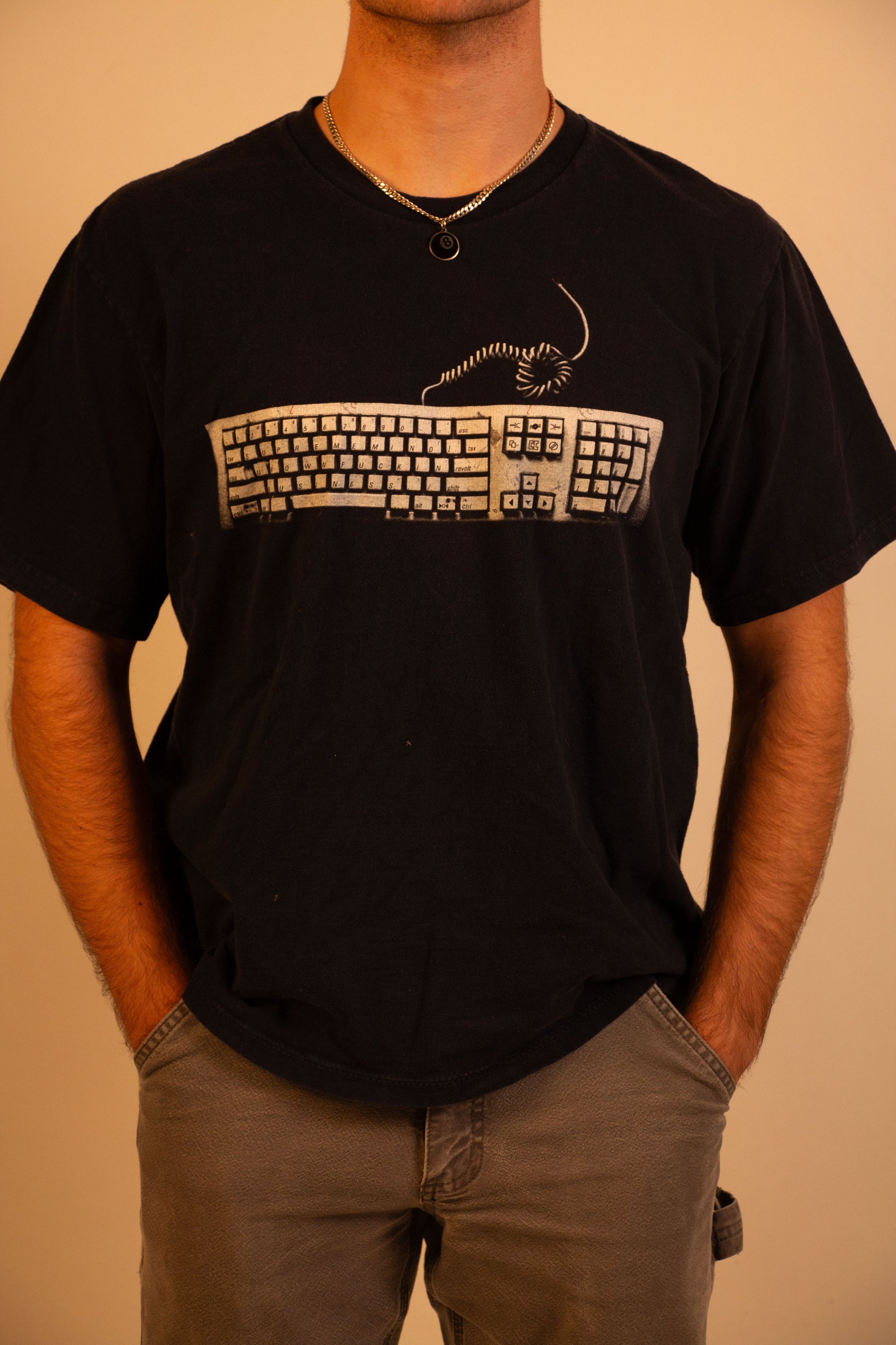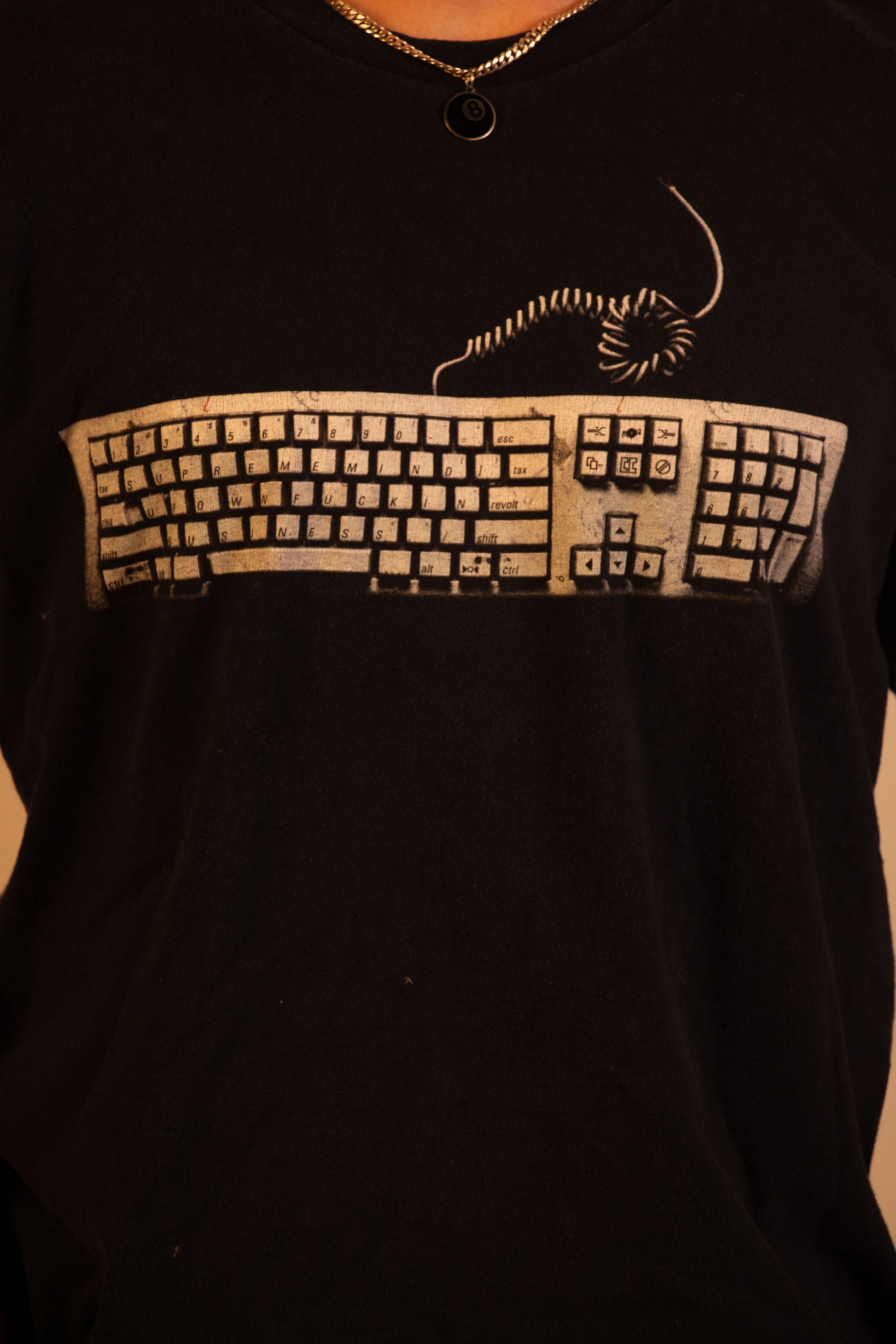 This shirt is from the Supreme Spring/Summer 2019 collection. It features a keyboard graphic with the words "Supreme Mind Your Own F***ing Business" on the keyboard. The shirt is size large.